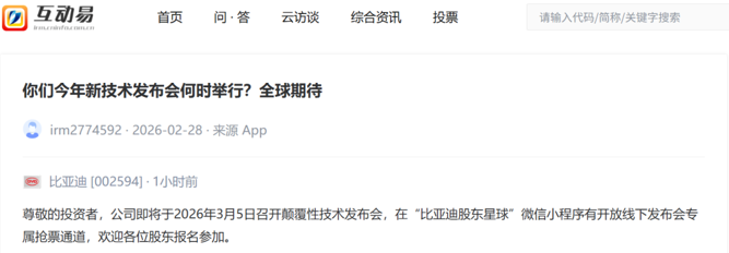 消息面上,3月2日,比亚迪在回复投资者提问时表示,公司即将于2026年3月5日召开颠覆性技术发布会,在“比亚迪股东星球”微信小程序有开放线下发布会专属抢票通道,欢迎各位股东报名参加。