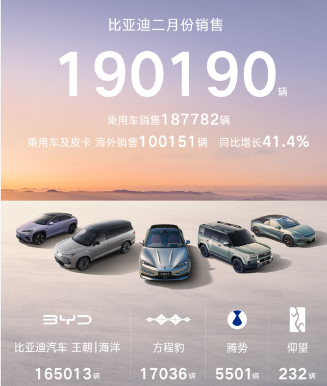 3月1日晚间,比亚迪公布2月销量数据。比亚迪2月销量达190190辆,蝉联中国新能源汽车销量冠军。其中,2月出口新能源汽车合计100600辆,首次超越国内销量。