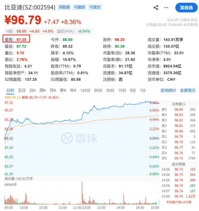 3月2日午后,A股比亚迪股价持续拉升,盘中最高达97.25元/股,涨近9%。截至当日收盘,比亚迪报96.79元/股,涨幅为8.36%;成交额超135亿元,总市值达8824.54亿元。
