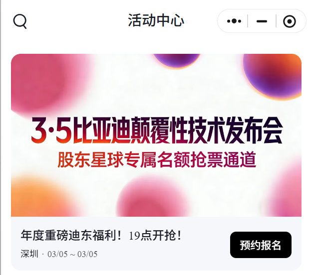 记者注意到,目前“比亚迪股东星球”微信小程序已显示“3·5比亚迪颠覆性技术发布会”的抢票通道,报名时间为3月2日19:00—20:00;活动时间为3月5日17:30—21:30,地点为深圳大运中心体育馆。