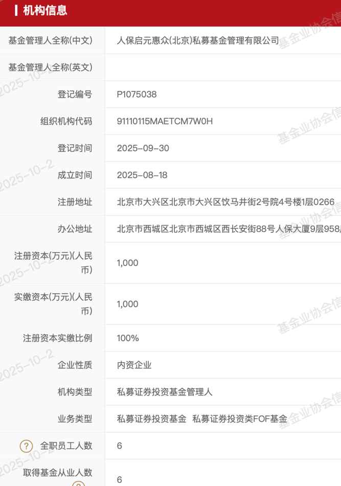 协会网站信息显示,人保启元惠众成立于2025年8月18日,于2025年9月30日完成私募证券投资基金管理人登记,目前有6名全职员工。