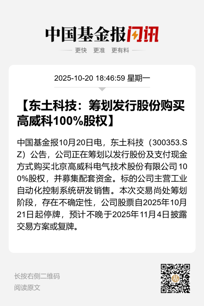 东土科技公告称,因有关事项尚存在不确定性,经公司向深圳证券交易所申请,公司股票自2025年10月21日开市时起停牌。公司预计在不超过10个交易日的时间内披露本次发行股份购买资产的交易方案,即在2025年11月4日前按照《公开发行证券的公司信息披露内容与格式准则第26号——上市公司重大资产重组》的要求披露相关信息。此次收购预计构成重大资产重组。