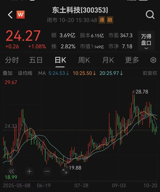 10月20日,东土科技股价以24.27元/股收盘,最新市值为149亿元。