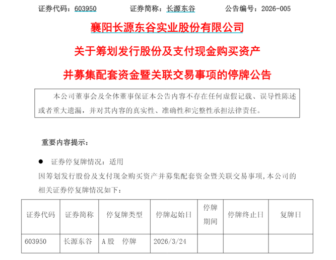 因本次交易尚处于筹划阶段,有关事项尚存不确定性,经申请,长源东谷股票将于3月24日开市起停牌,预计停牌时间不超过10个交易日。