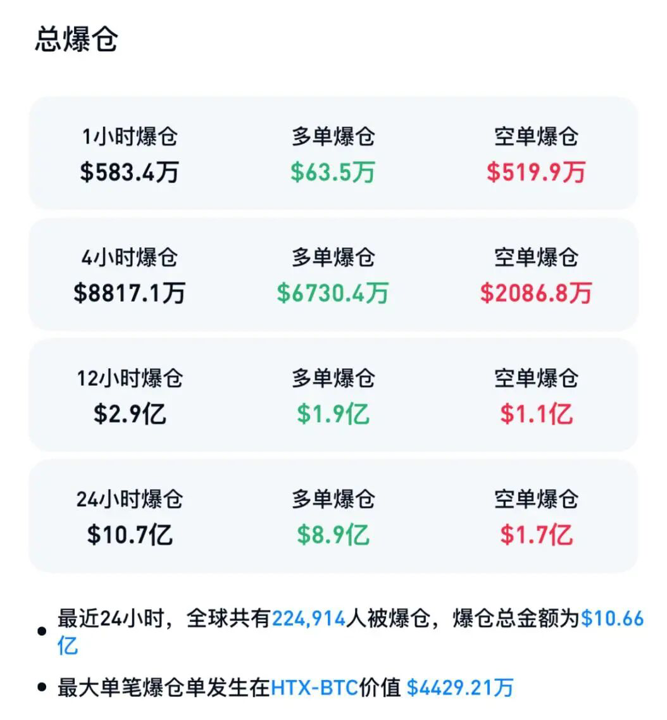 Coinglass数据显示,过去24小时加密货币市场共有超22.5万人被爆仓,爆仓总金额为10.66亿美元,其中多单爆仓8.9亿美元,空单爆仓1.7亿美元。
