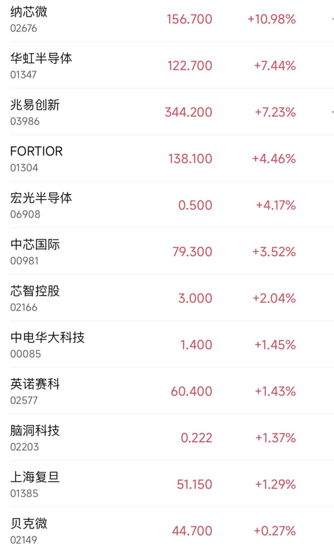1月28日,港股半导体股集体上涨,纳芯微涨近11%,华虹半导体、兆易创新涨超7%,宏光半导体涨超4%,中芯国际、芯智控股、上海复旦跟涨。