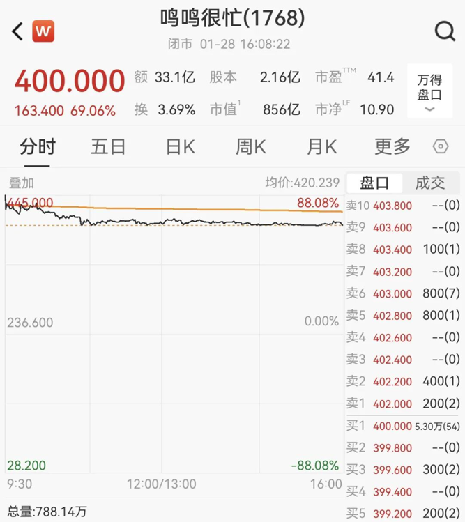 1月28日,港股新股鸣鸣很忙上市首日大涨近70%,市值达856亿港元。