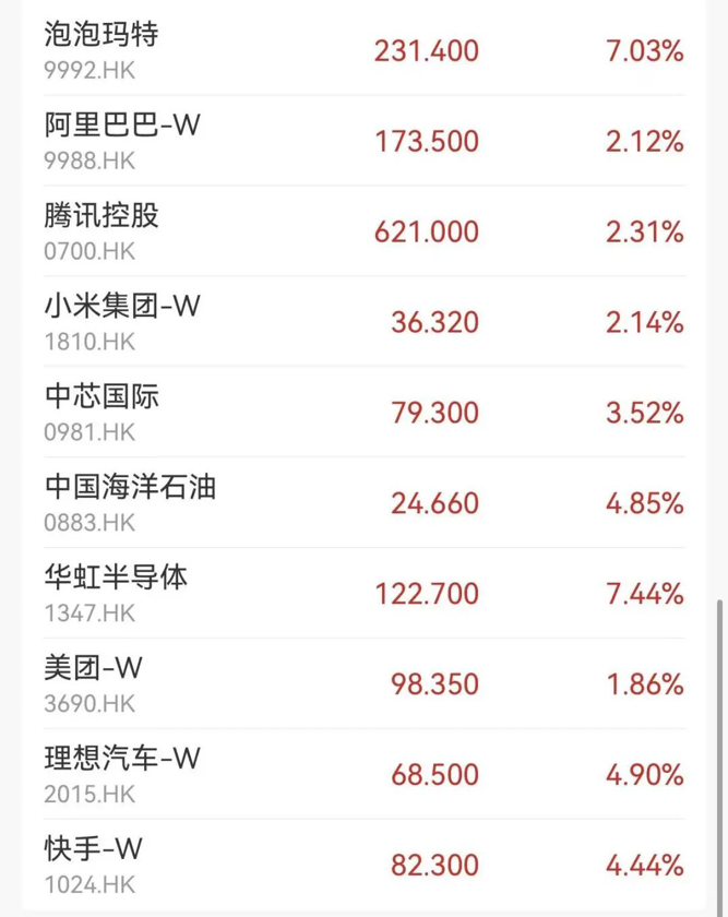 盘面上,科技股多数收涨,阿里巴巴、腾讯涨超2%,中芯国际涨超3%,华虹半导体涨逾7%;油气股集体走强,中国石油股份、中国海洋石油涨近5%;有色金属板块延续强势,中国铝业涨逾12%;黄金股上扬,赤峰黄金涨超10%,紫金黄金国际涨超8%;热门消费股泡泡玛特大涨超7%。