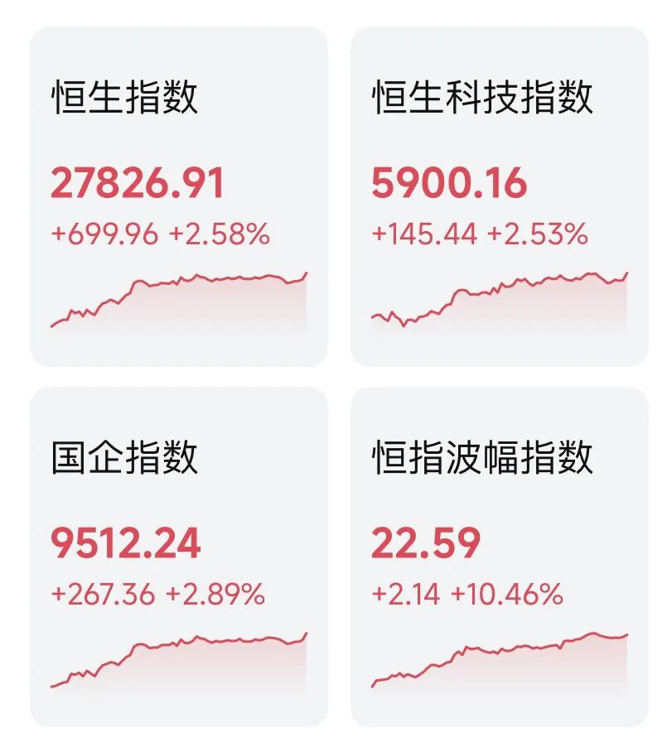 截至收盘,恒生指数收涨2.58%,报27826.91点,创2021年8月以来新高;恒生科技指数涨2.53%,报5900.16点;恒生国企指数涨2.89%,报9512.24点。