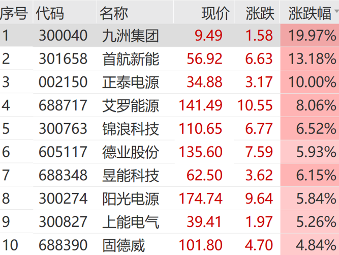光伏逆变器概念股集体大涨,九洲集团20cm涨停,正泰电源涨停,艾罗能源、锦浪科技、德业股份、阳光电源等纷纷走强。