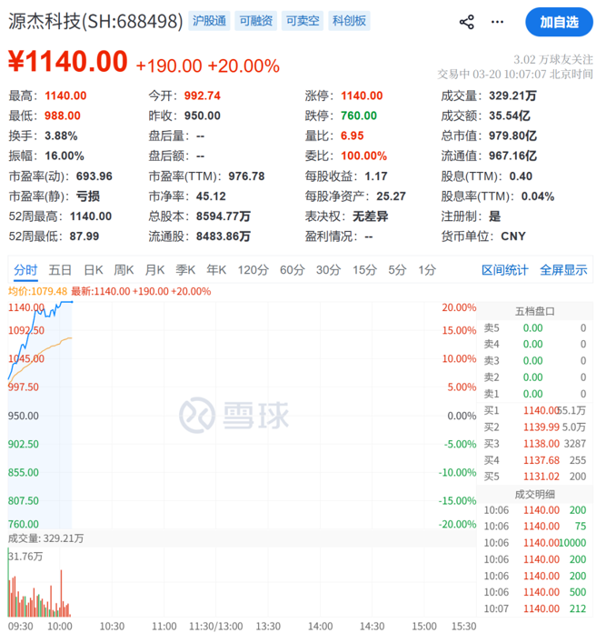 源杰科技走出20cm涨停,股价突破千元大关,成为A股历史上第8只千元股。截至发稿,源杰科技股价超越寒武纪,目前位居A股市场第二名。