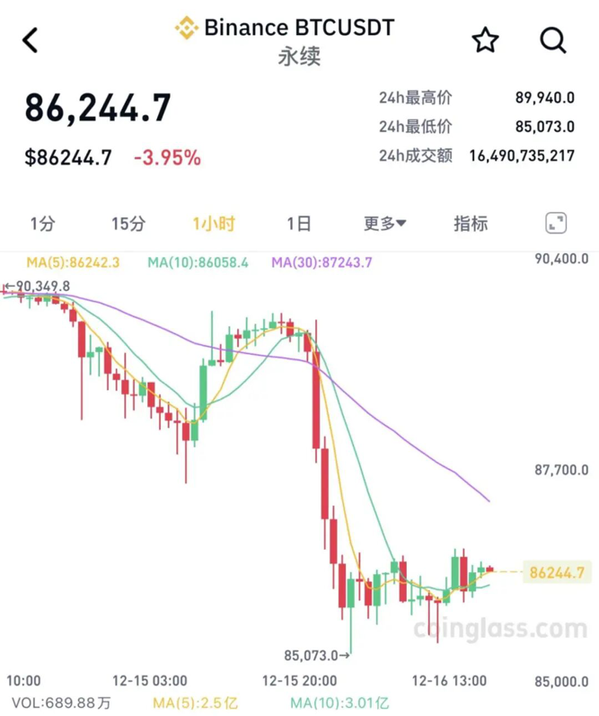 12月16日,比特币一度跌破86000美元关口,逼近年内低点。