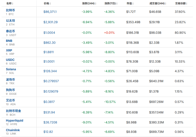 加密货币市场集体走低!