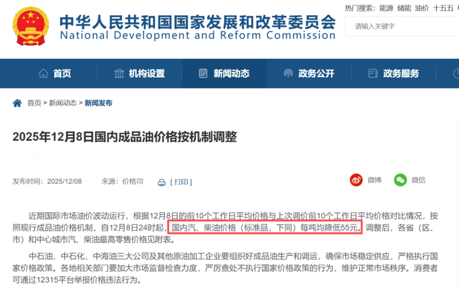 12月8日,国家发展改革委官网发布消息称,根据12月8日的前10个工作日平均价格与上次调价前10个工作日平均价格对比情况,按照现行成品油价格形成机制,自12月8日24时起,国内汽、柴油价格(标准品,下同)每吨均降低55元。