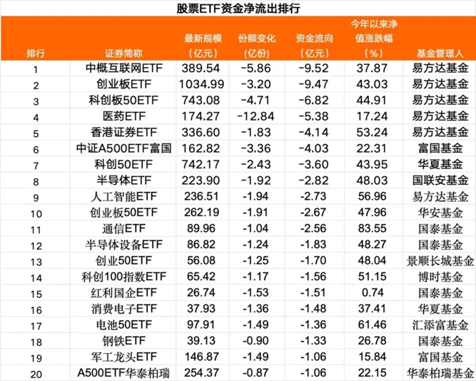 在资金净流出前20的股票ETF中,3只创业板ETF净流出近14亿元,3只科创相关ETF净流出近12亿元,此外,中概互联、新能源以及中证A500等相关ETF资金净流出也较多。