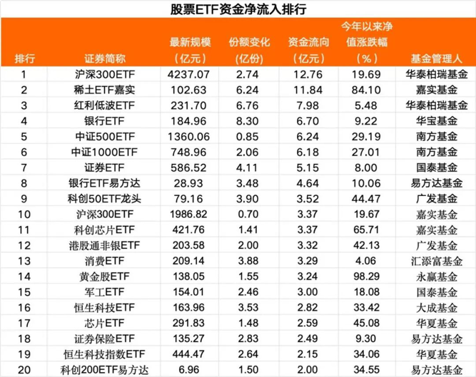 从资金净买入排行榜看,当日资金净流入1亿元以上的股票ETF有49只,部分宽基ETF和行业主题ETF净流入居前。其中,华泰柏瑞沪深300ETF、嘉实稀土ETF、华泰柏瑞红利低波ETF位居前三,资金净流入均超7亿元。