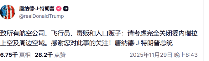 特朗普在社交平台上发文称:“致所有航空公司、飞行员、毒贩和人口贩子,请注意:委内瑞拉上空及周边空域已被视为完全关闭。”