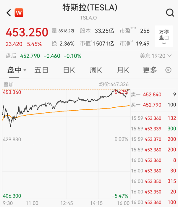 特斯拉大涨5.45%,报453.25美元/股。