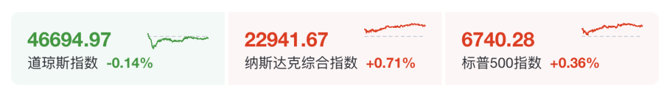 美国三大股指涨跌不一。截至收盘,道指跌0.14%,标普500指数涨0.36%,纳指涨0.71%。