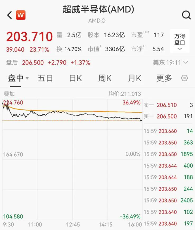个股方面,芯片制造商AMD股价飙升23.66%,报收于203.63美元/股,创2024年3月以来新高。