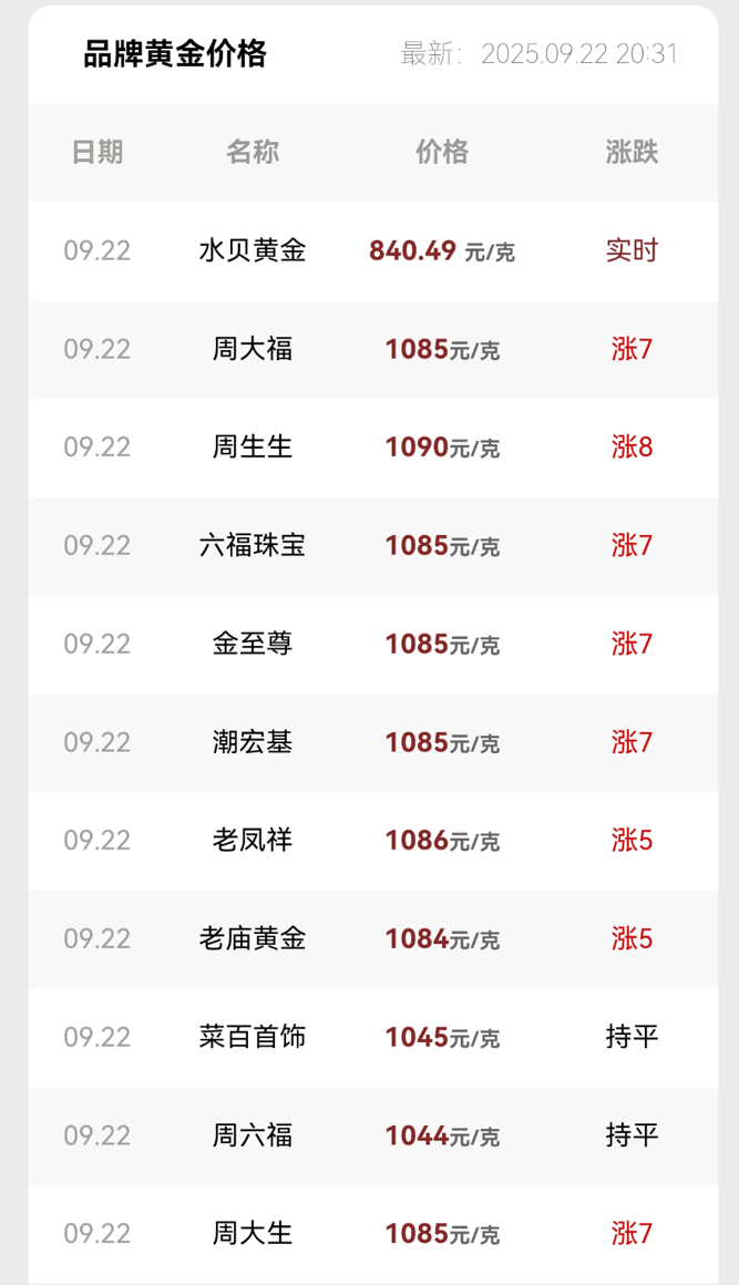 品牌金饰方面,截至发稿,周生生足金首饰价格达1090元/克,周大福、潮宏基、周大生等足金首饰价格均为1085元/克。