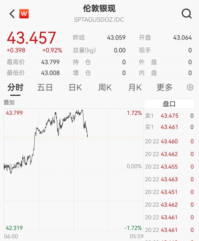 现货白银同步走高,盘中涨近43.8美元/盎司,创下逾14年新高。美国商品期货交易委员会(CFTC)数据显示,截至9月16日当周,纽约商品交易所(COMEX)白银投机客将净多头头寸增加360份合约。