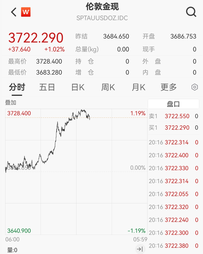 9月22日,现货黄金再度直线拉升,盘中突破3720美元/盎司高位。截至发稿,现货黄金最高价达到3728.4美元/盎司,再创新高。