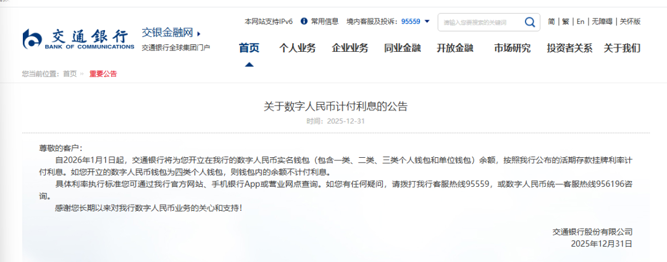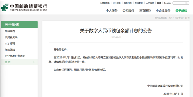 12月31日,工商银行、中国银行、农业银行、建设银行、交通银行以及邮储银行六家国有大行集体发布公告称,自2026年1月1日起,数字人民币实名钱包余额按照活期存款挂牌利率计付利息,计结息规则与活期存款一致。由此,数字人民币彻底告别“无息时代”。