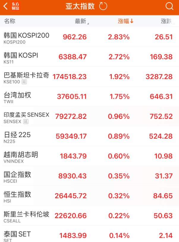 韩国KOSPI指数上涨2.7%,报6388.47点,创历史新高。此前一个交易日,这一以科技股为主的指数已经收复了中东冲突带来的全部跌幅。三星电子和SK海力士领涨大盘。