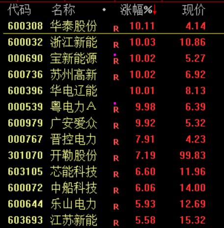 绿电概念股活跃,粤电力A、浙江新能、华电辽能涨停。
