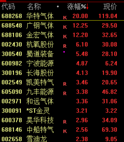 工业气体概念股走强,华特气体20cm涨停,金宏气体、广钢气体涨超10%。