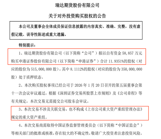 【导读】瑞达期货拟斥资5.89亿元收购申港证券11.94%股权