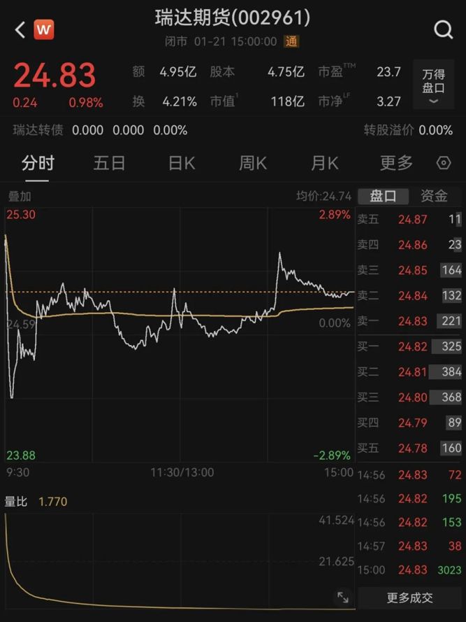 1月21日收盘,瑞达期货报24.83元/股,涨0.98%。