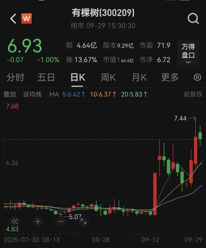 9月29日,有棵树股价以6.93元/股收盘,最新市值为64.4亿元。