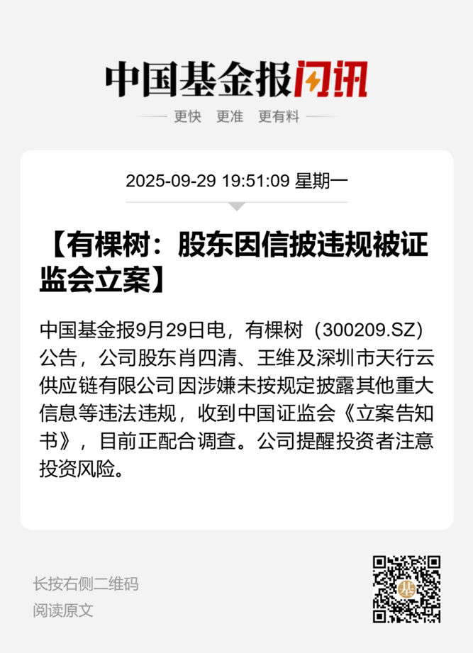 有棵树9月29日晚公告,公司股东肖四清、王维与深圳市天行云供应链有限公司近日收到中国证券监督管理委员会下发的《立案告知书》。因涉嫌未按规定披露其他重大信息等违法违规行为,根据《中华人民共和国证券法》《中华人民共和国行政处罚法》等法律法规,证监会决定对肖四清、王维与深圳市天行云供应链有限公司立案。