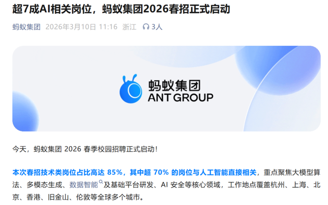 【导读】蚂蚁集团启动2026春季校园招聘,技术岗占比达85%,超七成聚焦AI领域