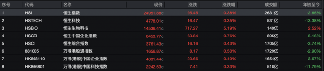 3月27日,港股震荡走高。恒生指数收涨0.38%,报24951.88点;恒生科技指数涨0.35%,报4778.01点;恒生中国企业指数上涨0.76%,报8453.77点。全日大市成交额为2630.81亿港元,较前一交易日的2616.62亿港元有所增加,南向资金净买出28.83亿港元。