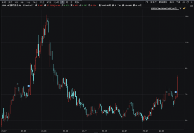 3月27日,基石药业-B大涨20.72%。消息面上,公司公布自主研发的PD-1/VEGF/CTLA-4三特异性抗体CS2009最新临床数据,在PD-L1 TPS≥50%的一线非小细胞肺癌患者中客观缓解率达90%,计划2026年底前启动Ⅲ期全球多中心临床试验。