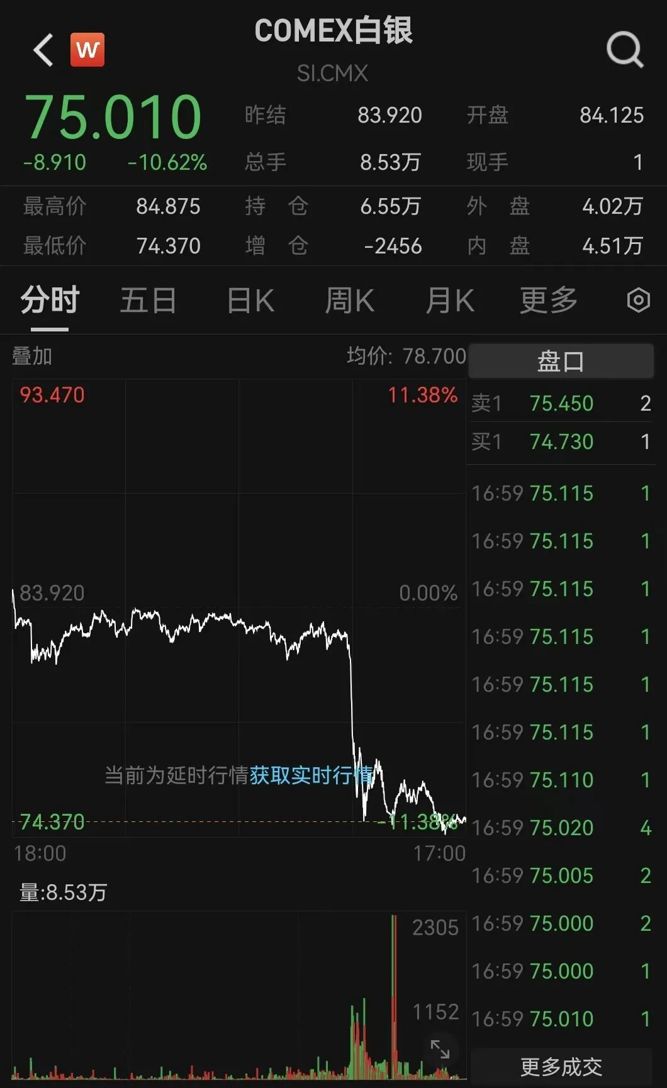 美股盘中时,黄金下挫超3%、跌破5000美元,白银则暴跌近11%。截至收稿,跌势仍在继续。