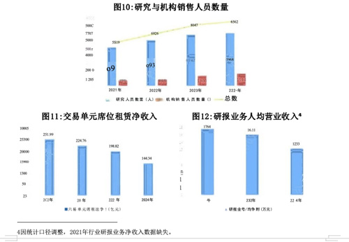 受费率改革等影响,交易单元席位租赁净收入下降42.7%至144.34亿元,同时,研究人员的大幅增加,也导致研报业务人均营业收入下滑30.10%至12.33万元。研究业务价值并不限于财务表现,如研报的市场影响力、对投资决策的支持度等均可体现价值。未来,随着研报质量和人员素质的提升,研究业务的贡献将进一步显现。