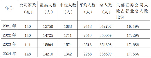 中证协发布的文件显示,截至2024年末,证券公司从业人员为33.57万人,较2021年减少7003人,降幅为2.04%。头部证券公司人数占行业总人数比例提升至17.56%,反映出人员向大中型证券公司集中。从近四年的存量盘整结果看,行业正从“人海战术”向“高质高效”人才战略转型。