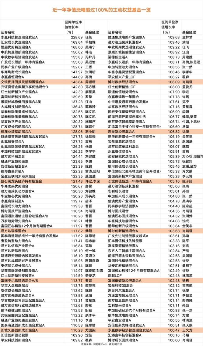 根据iFinD同花顺数据统计,截至1月19日,过去一年复权单位净值增长率超过100%的公募基金数量达到176只,其中主动权益基金达到124只。