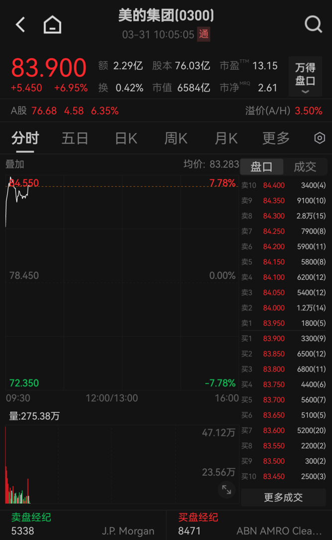 3月31日开盘,美的集团A股、H股均迎来超6%的涨幅,市值一度超5800亿元。