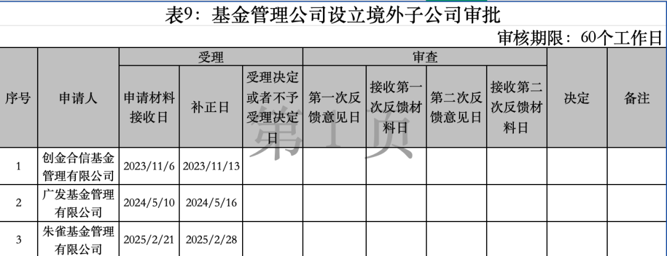 据证监会公布的最新审批情况,截至2025年9月16日,朱雀基金、广发基金等正在排队申请设立境外子公司。
