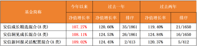 数据来源:iFind,截止时间:2025.9.26。安信成长精选混合A、安信洞见成长混合A的银河证券同类分类指混合基金-偏股型基金-偏股型基金(股票上下限60%-95%)(A类);安信新回报混合A的同类指混合基金-灵活配置型基金-灵活配置型基金(基准股票比例30%-60%)(A类)。安信新回报A今年以来、近1年、近2年、2019.7.10至2021年末业绩比较基准分别为:6.59%、16.06%、14.21%、17.40%;本基金自2016至2024年度的完整年度业绩/业绩比较基准增长率分别为:3.70%/2.49%(自生效)、9.56%/8.11%、1.98%/-10.43%、55.43%/17.88%、65.34%/13.47%、22.29%/-1.12%、-30.90%/-10.93%、-15.81%/-4.86%、9.21%/10.59%;基金成立日:2016-05-09;基金历任基金经理为:庄园(20160509-20181226) 谭珏娜(20181226-20210125) 陈鹏(20190710-至今)。安信成长精选混合A今年以来、近1年、近2年业绩比较基准分别为:13.10%、26.27%、21.43%;基金自2020至2024年度的完整年度业绩/业绩比较基准增长率分别为:2.84%/8.04%(自生效)、13.64%/-1.19%、-27.68%/-13.48%、-19.62%/-6.87%、9.16%/11.64%;基金成立日:2020-09-29;基金历任基金经理为:陈鹏(20200929-至今)。安信洞见成长A今年以来、近1年、近2年业绩比较基准分别为:16.52%、30.61%、25.72%;本基金自2023至2024年度的完整年度业绩/业绩比较基准增长率分别为:-22.13%/-8.23%、11.49%/12.76%;基金成立日:2022-12-13;基金历任基金经理为:陈鹏(20221213-至今)。(CIS)