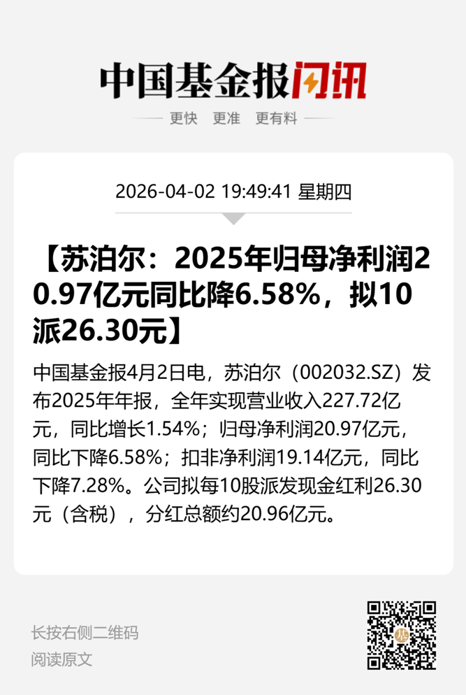4月2日晚间,小家电龙头企业苏泊尔(证券代码:002032)同步发布2025年年度报告与利润分配预案。在归母净利润出现五年来首次同比下滑的背景下,依旧推出近乎“清仓式”的高比例现金分红,延续其近年来的高分红惯例,引发市场广泛关注。