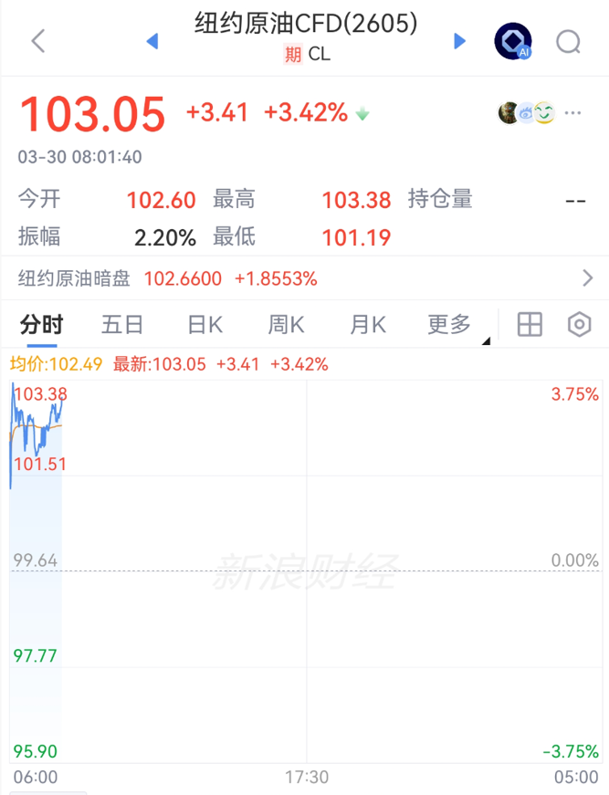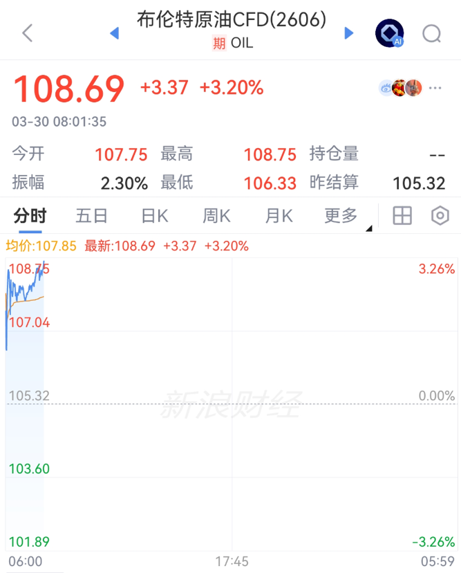 3月30日早间,国际原油价格飙涨,美油、布油涨幅双双超3%,布油站上108美元/桶,美油103美元/桶。