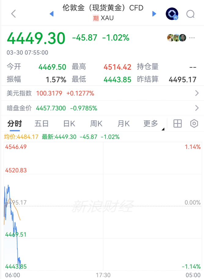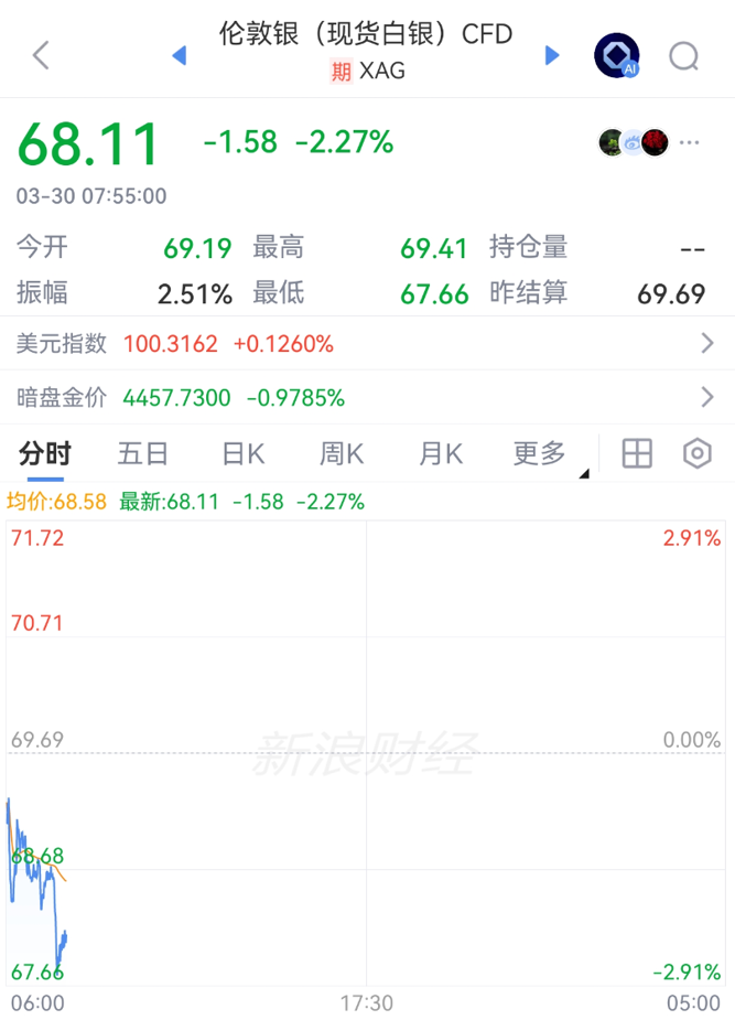 此外,由于中东冲突导致油价上涨,从而引发市场对通胀的担忧。3月30日,“油涨金跌”的局面再度出现,黄金、白银双双跳水。现货黄金跌下4450美元/盎司,跌超1%;现货白银盘中跌下68美元/盎司,跌近3%。