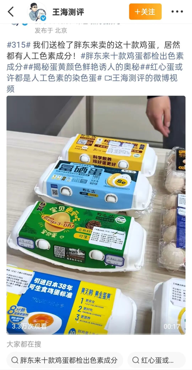 3月13日,知名打假人王海团队公开爆料称,送检了胖东来卖的十款鸡蛋,均检出人工角黄素(斑蝥黄),直指品牌涉嫌虚假宣传。
