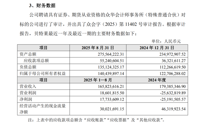 财务数据显示,贝特莱2025年1—8月实现营业收入1.66亿元,净利润为1773.36万元。而在2024年,该公司仍处于亏损状态。